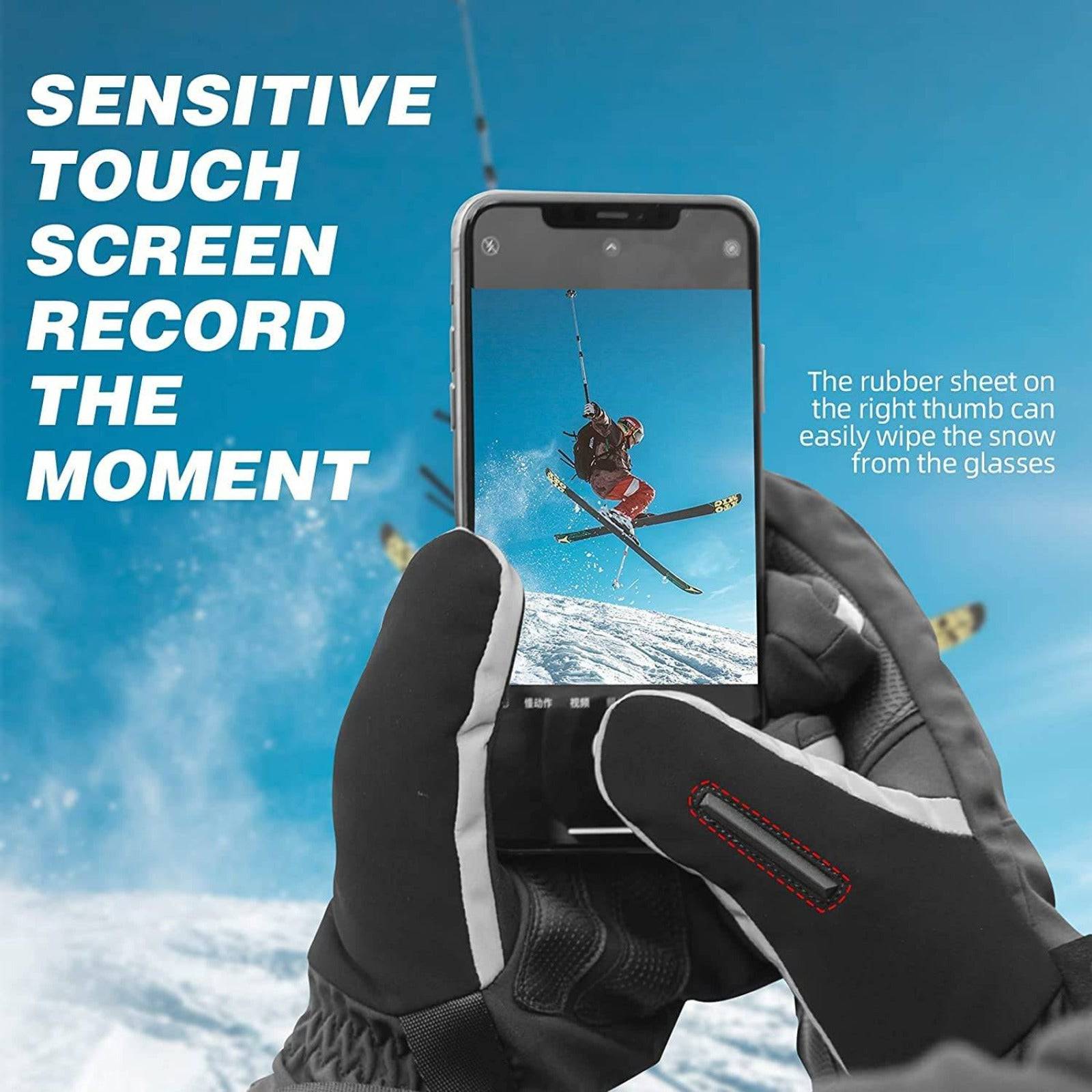 • Die Fingerspitzen des Zeigefingers und des Daumens von unsere Ski Handschuhe bestehen aus leitfähigem Stoff und. Das Touchscreen-Design ermöglicht es Ihnen, Ihr Telefon zu verwenden, ohne Ihre Handschuhe auszuziehen. Es ist praktisch für Sie, während des Skifahrens Fotos und Videos aufzunehmen und Anrufe entgegenzunehmen. Sie können Ihr Navigationsgerät auch während der Fahrt verwenden.